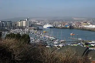 Although there are some signs of the derelict facilities that serviced the former train ferry operations, the port still sees a great deal of freight and passengers movement.[9] International ferries run to the French port of Dieppe, Seine-Maritime, operated by DFDS Seaways.[10] There are two outbound sailings per day, one in the morning and one in the evening, using the 18,654 GT ro-ro ferry MS Côte D'Albâtre.[11] Rail passengers wishing to connect with the ferries are advised nationally to travel to Newhaven Town, and then use the free bus service; this has resulted in a dramatic fall in passenger services at Newhaven Harbour, leading to questions regarding its future and that of Newhaven Marine.