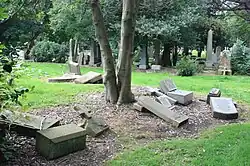 Of particular note are the enclosed area for Jewish burials (against the east boundary wall) and the high number of war graves (mainly in the southern half). The cemetery contains 156 Commonwealth service war graves, 142 from World War I and 14 from World War II, mainly dead from wartime military hospitals. Those whose graves are not marked by headstones are listed by name on the Screen Wall Memorial in the main War Plot (Section A1).[4]