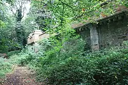It contains a section of vaults to the north-west, laid out on a north–south axis. It was intended to be larger but was curtailed by the building of the railway line.