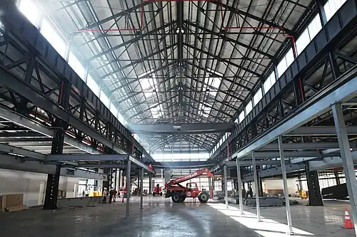 Recladding the building's armature and repurposing of the 51,000 ft2 machine shop into an 84,000 ft2 multidisciplinary design, prototyping, and advanced manufacturing space took approximately 5 years and continued until the company's full opening in September 2016.[20] The undertaking utilized approximately 9,000 lbs of steel in total according to the developer.[21]