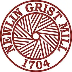The Newlin Mill Complex, also referred to as The Newlin Grist Mill, is a water-powered gristmill on the west branch of Chester Creek near Concordville, Pennsylvania built in 1704 by Nathaniel and Mary Newlin and operated commercially until 1941. During its three centuries of operation, the mill has been known as the Lower Mill, the Markham Mill, the Seventeen-O-Four Mill and the Concord Flour Mill.[3] In 1958 the mill property was bought by E. Mortimer Newlin, restored and given to the Nicholas Newlin Foundation to use as a historical park.[4] Water power is still used to grind corn meal which is sold on site. The park includes five historical buildings, which were added to the National Register of Historic Places in 1983, and 150 acres (61 ha) of natural woodland.[5]