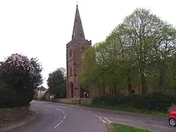 The parish church, called St Michael and all Angels,[3] is a former chapel of a parent church at Badby. The benefice has always been Badby-cum-Newnham, with the vicarage of Badby. As the church is perched high on a bank, the churchyard descends steeply east and south. The chancel, the north aisle and the present nave were built in the early 14th century, on the site of a 12th-century chapel. The western tower was built in the late 14th or early 15th century abutting the west wall and standing on three open arches. The tower has contained six bells since 1660. They were rehung on a new iron frame by John Taylor & Co in 1940.