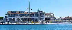The Newport Harbor Yacht Club facility has a main dining room and outdoor seating, a private beach, and a pavilion equipped with a barbecue and snack bar. There are mooring cans, plus both wet and dry slips available for members and guests. The wet slips can accommodate boats up to 55 feet in length, and the dry slips are for smaller boats up to 25 feet in length. The club is open 5 days a week, plus a full-time dock staff and shore boat.[1] The club has applied for a building permit to replace their 1919 clubhouse with a larger, modern building.[2]