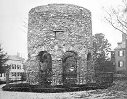 The tower is located at the upper end of the plot behind the now-demolished mansion built by Benedict Arnold, the first colonial governor of Rhode Island, who moved from Pawtuxet to Newport in 1651.[7][8] In 1677, Arnold mentions "my stone built Wind Mill" in his will; the site for his burying ground is between this mill and his mansion and still exists today.[9] The phrase has therefore generally been accepted as referring to the Newport Tower, and is evidence that the tower was once used as a windmill. Still, others have contested that locals remembered the tower was previously a functioning corn mill, and that since it had a ground-level fireplace, it couldn't have been built as a windmill.[10]