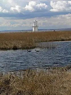 The East Usk Lighthouse is within the reserve on the estuary trail facing towards the Severn Estuary. It is a basic lamphousing with no accommodation. The more substantial decommissioned West Usk Lighthouse, currently operating as a hotel, is on the opposite (west) bank of the River Usk and can be viewed from the reserve. It was constructed in 1893 by Trinity House and entered service on or about 22 June that year.[10]