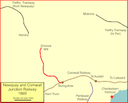 The Newquay and Cornwall Junction Railway was a 7 ft (2,134 mm) broad gauge railway intended to link the Cornwall Railway with the horse-worked Newquay Railway. It opened a short section to Nanpean in 1869, the remainder being built by the Cornwall Minerals Railway who took over the company in 1874. Its main traffic has always been china clay.