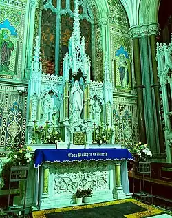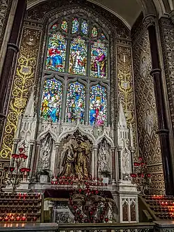 The Chapel of the Blessed Virgin is located to the left of the main Sanctuary displays the same ornate decoration in marbles and mosaics. A number of invocations from the Litany of the Blessed Virgin Mary, all worked in mosaics with accompanying symbols mainly in gold, are seen on the wall around the altar. The altar itself, in Carrara marble generally, carries columns in Sienna and Rosso Corallo, with small panels in Levanto Red. The tabernacle door has a gold finish and above stands a marble statue Our Lady of Lourdes. The two small panels in the marble reredos present the Annunciation and the Coronation of the Virgin. The stained glass window over the altar shows The Virgin Mary with the Child Jesus. The Virgin's parents, St. Joachim and St. Anne are shown in mosaics on either side. The sanctuary lamp in this chapel was presented by the Children on Mary Sodality, on the occasion of the Consecration in 1925. To the Left of the altar is a stained glass window showing Christ blessing the Little Children. The ceremonial processional entrance to the sacristy in located in the Lady Chapel.[4]