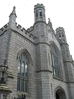 The cathedral replaced St Mary's Church (the Old Chapel), which had been constructed by Bishop Lennan in 1789 and which, for forty years, doubled as both a parish church and quasi-cathedral, two bishops having received episcopal consecration there.[2] Newry Cathedral, dedicated under the joint patronage of St Patrick & St Colman, was designed by the city's greatest native architect Thomas Duff; work began in 1825, with the basic building completed in 1829.[3] Built of local granite, it was the first Catholic cathedral in Ireland opened after Catholic Emancipation.