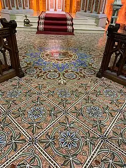 The clerestory walls in the sanctuary contain a vast quantity of gold and Blue Venetian mosaic work which depicts the objects associated with Christ's Crucifixion. (Cross, chalice, scourging etc.).