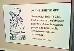 Since 1952, the News-Miner has featured a small cartoon figure named "Sourdough Jack" at the bottom of its front page. The drawing of Sourdough Jack is always paired with a comment on a news story, pun, or joke, apparently having been spoken by the figure. The idea for Sourdough Jack came from News-Miner editor John J. Ryan, who said, "People had many complaints about the town. ... He could make fun of that stuff and that would give people a chance to laugh at their problems."[44] Sourdough Jack's name came from Ryan's nickname (Jack) and the traditional nickname given to an old miner (sourdough).[44] Jack Ryan worked for the Seattle Post-Intelligencer later in his life. He got tired of his mail getting mixed up with another journalist, so in the '70s he legally changed it to John O'Ryan.[45]