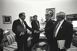 During negotiations with the Democrats who held majorities in the House and Senate, President George H. W. Bush reached a deficit reduction package which contained tax increases despite his campaign promise of "read my lips: no new taxes". Gingrich led a revolt that defeated the initial appropriations package and led to the 1990 United States federal government shutdown. The deal was supported by the President and Congressional leaders from both parties after long negotiations, but Gingrich walked out during a televised event in the White House Rose Garden. House Minority Leader Robert H. Michel characterized Gingrich's revolt as "a thousand points of spite".[55][56]