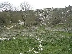 North, East and West Hill all surround Saddlecombe. North Hill (TQ 270 120) has two prominent Bronze Age barrows in which, despite being previously robbed, archeologists found pottery vessels, a skeleton and a dagger.[12][5] The barrows themselves sit at the top of the hill in an island of old acid grassland. There are treasures still there in the form of betony, eggs and bacon, tormentil and knapweed, and in autumn (in a good year) a real cornucopia of colourful waxcaps, coral fungi and earth tongues, including several old pasture indicator species. West Hill has some pristine old chalk grassland with an up-slope fringe of scrub and some rare dyer’s greenweed.