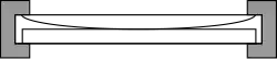 Consider monochromatic (single color) light incident from the top that reflects from both the bottom surface of the top lens and the top surface of the optical flat below it.[3] The light passes through the glass lens until it comes to the glass-to-air boundary, where the transmitted light goes from a higher refractive index (n) value to a lower n value. The transmitted light passes through this boundary with no phase change. The reflected light undergoing internal reflection (about 4% of the total) also has no phase change. The light that is transmitted into the air travels a distance, t, before it is reflected at the flat surface below. Reflection at this air-to-glass boundary causes a half-cycle (180°) phase shift because the air has a lower refractive index than the glass. The reflected light at the lower surface returns a distance of (again) t and passes back into the lens. The additional path length is equal to twice the gap between the surfaces. The two reflected rays will interfere according to the total phase change caused by the extra path length 2t and by the half-cycle phase change induced in reflection at the flat surface. When the distance 2t is zero (lens touching optical flat) the waves interfere destructively, hence the central region of the pattern is dark.