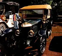 The car had a 2155 cc four-cylinder, water-cooled, side-valve engine[2] This was directly attached to a four-speed gearbox and then by shaft to the rear axle. A compressed air starter was fitted. The steel section chassis had half-elliptic leaf springs all round. The brakes followed the convention of the time, with the hand lever operating the rear drums and the foot pedal a transmission brake. Even though the cars were right hand drive, the gear change lever was on the driver's right side, as was the custom at the time. The car was distinguished by a sharply V-shaped radiator.