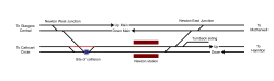 The crash was attributed to the Cathcart Circle train passing a signal at danger and causing a collision at the single-lead junction, as at Bellgrove in Glasgow just over a year earlier. The junction's configuration was newly installed at a cost of £5 million and designed to be simpler than the double-lead junction that it replaced.[6] This allowed faster running on the WCML following the East Coast electrification (through Carstairs) but was inherently less safe. The configuration was unnecessarily constrained and was strongly criticised in the crash report[7] and by contemporary commentators (Hall 1999).