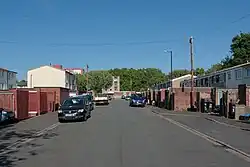 Newtown was the first district earmarked in Bristol’s 1952 Development Plan for total demolition, despite the region largely avoiding the Bristol Blitz.[3][7] Victorian courts west of Barrow Road disappeared in phases (1953–70);[8] many residents were rehoused in tower blocks such as Barton House. Bristol Corporation used a wrecking ball demolition method, flattening whole rows such as Regent Terrace during 1967–69.[9] Seeking a low-rise alternative, the city laid out the Newtown Estate in the Radburn design, which opened in 1971.[10] The period also brought major road construction in the immediate vicinity, including Lawrence Hill roundabout and St Philip’s Causeway in 1973, erasing shops and pubs on Lawrence Hill and cutting pedestrian links to Old Market as part of the Outer Circuit Road scheme.[3] The Midland Railway locomotive shed on Barrow Road, opened in 1873 for St Philip's railway station, was closed in 1965 and was demolished two years later. The former trackbed now forms part of the Bristol and Bath Railway Path.[11]
