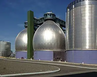 The Newtown Creek Wastewater Treatment Plant is the largest sewage treatment facility operated by the New York City Department of Environmental Protection.[1] Since 2010, its eight metallic "digester eggs", which are 140 feet (43 meters) tall and dramatically illuminated with blue light at night, have made it a local landmark,[2] particularly to motorists on several nearby roadways in the New York City boroughs of Brooklyn, Queens, and Manhattan.[1] It is located on the Newtown Creek in Brooklyn's Greenpoint neighborhood along Greenpoint Avenue.
