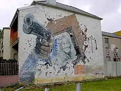 Since the 1980s, the area surrounding the Sydney inner west suburb of Newtown, Australia, including the suburbs of Newtown, Enmore, Erskineville, Camperdown, and St Peters, has been known for its wide range of prominent graffiti and street art on walls.[1] The public visual art in the Newtown area consists of a variety of styles and methods of execution, including large-scale painted murals, hand-painted (or sprayed) political slogans, hand-painted figurative designs, spray painted semi-abstract designs (including large-scale and elaborate semi-pictorial) "tags"), and other stylistic developments such as stencil art and street poster art (also known as "wheatpasting"), "Yarn bombing", and sculptural items cast from plaster and other materials.[2]