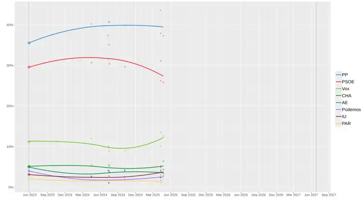- ^ "[A] ARAGÓN. Encuesta SigmaDos (interna PP) 22/07/2025: PP 40,6% (31/32), PSOE 24,1% (17/19), VOX 12,1% (7/9), CHA 6,5% (3/4), IU 5,3% (2/3), PODEMOS-AV 2,8% (0/1), EXISTE 2,6% (1/2), PAR 1,7% (0/1)". Electográfica (in Spanish). 22 July 2025.