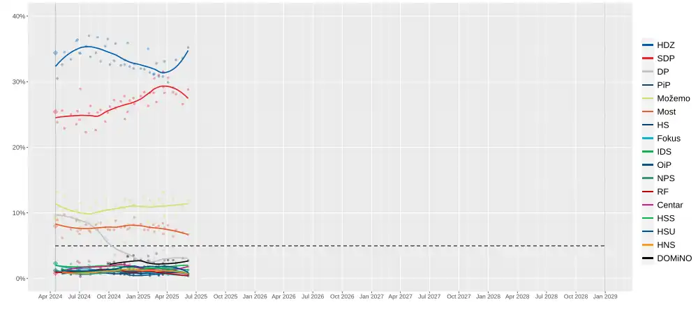 | Publication date | Polling firm | Votes | HDZ | SDP | DP | DOMiNO | PiP | Možemo | Most | HS | Fokus | IDS | NPS | RF | Centar | HSS | HSU | HNS | Others | Undecided | Lead |