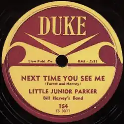 "Next Time You See Me" is a blues song written by Earl Forest and Bill Harvey, originally recorded in 1956 by Junior Parker (as "Little Junior Parker" as he was then known).[1] The song was Parker's first record chart appearance after joining Duke Records and one of his most successful singles in both the R&B and pop charts.[2] "Next Time You See Me" has been performed and recorded by various artists, such as the Grateful Dead.