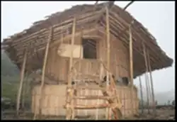 The traditional villages of the Ngalum people are circular or round in shape and are located on hillsides. These houses are called Ap Iwol. The walls of the house are made from branches, tree limbs, and pine wood planks arranged in a circular pattern. The floor is made from the bark of the nipa palm tree. The house has no windows, but there are doors at the front and back entrances. The doors are built about half a meter above the floor, so the inhabitants inside cannot be seen from the outside, and a ladder is provided for access. The roof slopes to the sides, not in a conical shape, and is supported by a frame and stakes surrounding the walls of the house.[17]
