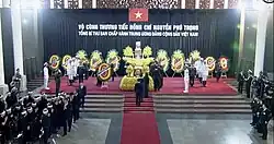 Several activities to mourn Trọng were organized during the week of 22 and 28 July 2024. A state funeral was held on 25 and 26 July, culminating with Trọng's burial at the Mai Dịch Cemetery on 26 July at 15:00 (local time).[92][93] Among those who attended were representatives of over 20 countries and organizations, including the General Secretary of the Lao People's Revolutionary Party Thongloun Sisoulith, South Korean Prime Minister Han Duck-soo, former Japanese Prime Minister Yoshihide Suga and European Commission Vice President Josep Borrell. Other senior officials from China, Cuba, India, Indonesia, Thailand, Russia and many others were presented as well.[94] In addition, the US Secretary of State Antony Blinken also went to Vietnam to visit and condoles Trọng's family on 27 July 2024.[95]