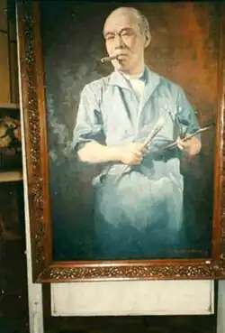 He painted portraits of notable people such as President Ba U, film star Wah Wah Win Shwe and film director Shumawa U Kyaw.[3] His mnemonic powers in Burma, in which he painted portraits of subjects from memory, were famous in Burma,[1] although he is also known to have started a painting from a photograph and then only require the model for the final stages.[8] He made a series of paintings of historic events, including "The Battle of Shwedaung", "The Flag Hoisting Ceremony on Independence Day", "The Panlong Accord" and "the Nay Thurein Congress". Other works depicted scenes of the Jataka tales, and events in the life of the Buddha. He traveled widely in Burma to find subjects, making sketches that he would later paint in oils or watercolours, often scenes of the daily life of ordinary people[3] and particularly portraits of Burma's many ethnic peoples.[1] The latter subject was a major enterprise which he embarked upon.