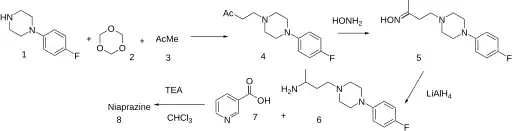 A Mannich reaction using 4-fluorophenylpiperazine (1), 1,3,5-trioxane (2) and acetone gives the ketone (4). Reaction with hydroxylamine produces the oxime, (5), which is reduced with lithium aluminium hydride to give the amine (6). Amide formation with nicotinic acid (7), activated as its acid chloride, yields nilaprazine.[15][16]