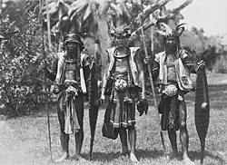 Today the Nias people are almost always presented as a warlike people known for their headhunting tradition and inter-village conflicts in the past, where the manufacture of weapons was highly regarded above agricultural implements.[23] Despite this, none of the war-like activities are carried out by the Nias people as the majority of the Nias people have been converted to Christianity.[24] Nevertheless, the Nias people were still known as a skillful weapon and armor-makers.