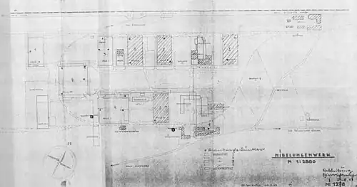 Eventually, the factory consisted of a total of nine halls. Seven halls were 120 meters long and 60 meters wide and made of reinforced concrete. The other two halls were of steel construction and were 120 meters long and 120 meters wide. In order to maintain production even after bombing raids, the factory was supplied with electricity, compressed air, heat and water through an underground system. The factory was also connected to two railway lines, with each hall having its own siding.