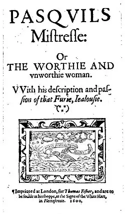 - ^ N[icholas] B[reton]; Morphorius [pseudonym] (1600). Pasquils Fooles-cap Sent to Such (to Keepe Their Weake Braines Warme) as are Not Able to Conceiue Aright of His Mad-cap. With Pasquils Passion for the Worlds Wayardnesse. Begun by Himselfe, and Finished by His Friend Morphorius. London: Imprinted at London [by R. Bradock], for Thomas Iohnes, dwelling neere Holborne Conduit. OCLC 1356123019.
