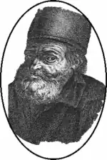 ![]() Flamel as represented in 1402 on the portal of Sainte-Geneviève des Ardens (from Étienne François Villain, 1761) | |
