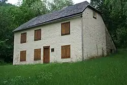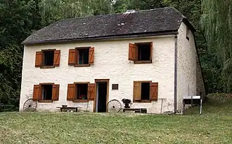 John and Mary Marnach, with their son Nicholas,[5][6] were immigrants from the commune of Rambrouch in Luxembourg.[7] Many of their countrymen had settled in the communities of Elba and Rollingstone in Winona County.[8] Most of the settlers built simple, subsistence-style residences, but the Marnachs opted to employ construction methods hearkening back to medieval Germany.[3] Farmers and stonemasons by trade, they constructed a home for themselves in four stages from 1857 to 1860.[7] The house stood on a stagecoach road between Minneiska and Plainview, Minnesota.[8] It was part of the now-abandoned townsite of Whitewater Falls.[3] A wooden lean-to was added to the rear of the house in 1914.[7]