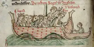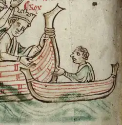 Detail of a marginal drawing of Henry III and Eleanor returning by sea from Gascony, with Nicholas de Molis is in a small boat alongside.