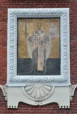 The icon of Saint Nicholas of Mozhaisk was installed on the wall of Nikolskaya Tower above the Nikolsky Gate to Moscow Kremlin. The icon is dated to the end of 15th - beginning of 16th century.[4][5]