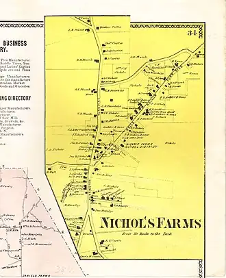 Nichols is named for the family that maintained a large farm in its geographic center for almost three hundred years. In May 1725, the northwest farmers of Stratford petitioned the Colony of Connecticut to form their own village. The farmers wished to call their new Parish Nichol's Farms. The legislature approved their new village in October 1725, but named the new parish Unity. Unity became a part of North Stratford in 1744 when it merged with the parish of Long Hill, Trumbull, which had been founded in 1740. When it incorporated in 1797, the Nichols village became a school and taxing district as a part of the Town of Trumbull.[17]