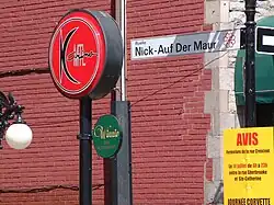 He was strongly opposed to the practice of renaming streets after well-known individuals. Therefore, after his death, when it was decided to honour him with a street name, it was necessary to find a street with no name. A small alley off of Rue Crescent, at whose bars Auf der Maur was a regular, was therefore renamed Ruelle Nick-Auf der Maur.[2]