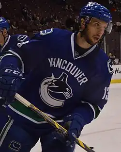 On June 27, 2014, after a breakout season in 2013–14, Bonino was traded to the Vancouver Canucks with defenseman Luca Sbisa and a first- and third-round pick in 2014 in exchange for Ryan Kesler and a third-round pick in 2015.[77] While playing with the Canucks during the pre-season, Bonino tallied two goals and two assists for four points through five games.[78] He continued to show off his offensive abilities during the regular season and quickly became one of the Canucks top point scorer. By the seventh game of the season, Bonino had tallied two goals and two assists for four points.[79] While maintaining his scoring prowess, Bonino centred the Canucks second line between Alex Burrows and Chris Higgins.[80] By the end of October, Bonino had accumulated four goals and five assists through the first 12 games of the season.[81] He continued to build momentum throughout November and December and was consistently ranked among the Canucks top scorers.[82][83] Bonino finished the first quarter of the season with eight goals and 13 assists for 21 points through 34 games.[83]