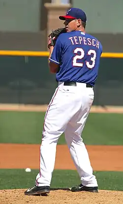 Invited to spring training in 2013, Tepesch won the Rangers' fifth starter job.[8][9] On April 9, Tepesch went 7+1⁄3 innings and gave up four hits, three walks, one run, and struck out five while getting the win in his major league debut against the Tampa Bay Rays.[10] He ended the 2013 season with a record of 4-6 with a 4.84 ERA in 19 games (17 starts). The following season, he started 22 games for the Rangers, going 5-11 in 126 innings.