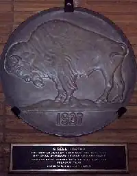 Robert Kunkel, a UND alumnus and Chicago advertising executive, was the originator of the trophy, and Blue Key, an honorary service fraternity at NDSU, and the UND Blue Key (Student Government after their Blue Key Chapter dissolved) administered the annual awarding. It is an oversized 75-pound replica[1] of the James Earle Fraser-designed U.S. buffalo nickel with a buffalo on one side representing NDSU Bison and a Native American head on the other side representing UND, who were known as the Fighting Sioux until 2012. Fraser, best known for his sculpture, "The End of The Trail", was born in Winona, MN and lived for a time in Dakota Territory. The coin-shaped trophy's "mint" date is 1937, the year the trophy was created. Jack Sather, a native of New England, ND, was commissioned to design and act a sculpture of the award. It took six weeks to complete the job and he was paid $1,650 for his work. Those funds were raised by both NDSU and UND Blue Key chapters from members and friends. The Nickel, at 250 times larger than a regular five-cent piece, weighs 75 pounds and is 2 inches thick and 22 inches in diameter. Both sides were 3/4" relief and, from the original models, plaster casts were poured. The casts were hauled to a St. Paul, MN foundry where plaster copies were recast in an aluminum alloy. The halves were welded together to make the finished piece. It was first awarded in 1938 when NDSU won 17–13. It has been the object of many theft and "kidnapping" attempts by students from both universities. Governor William Langer was asked to participate in the unveiling of the new award in Grand Forks. Moments after the unveiling an unidentified student stepped up to Governor Langer, told him "I'll take care of this for you", and disappeared with the nickel trophy. It turned up 36 hours later on the front lawn of then UND President John C. West (The Forum of Fargo-Moorhead, October 21, 1967) and a new tradition of "kidnapping" or "borrowing" the trophy had begun. The trophy retired after the 2003 season. While the rivalry was renewed in 2015, the trophy remained retired and is currently displayed at the North Dakota Heritage Center in Bismarck.