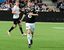 On 6 March 2017, Bendtner signed for Norwegian club Rosenborg for an undisclosed fee.[104] He made his debut as a second-half substitute in the Mesterfinalen of 2017 against Brann, and supplied the assist for the second goal in a 2–0 win.[105] He also scored his first league goal in his Eliteserien debut against Odds at Lerkendal.[106] On 12 August, Bendtner scored a trivela goal from outside the penalty box in a 2–1 win over Molde FK.[107]