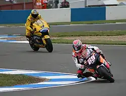 At the penultimate round in Portugal, Rossi took pole position on Saturday with Hayden starting in third position.[53] On race day, Hayden was taken out by his teammate Dani Pedrosa on the fifth lap after Pedrosa tried to overtake him but failed, lost the front and hit Hayden, causing both riders to retire. This first and only retirement of the year would hand Rossi the championship by eight points going into the last round of the season.[54] However, because Rossi finished second—just 0.002 behind race winner Toni Elías—he took away five points from Rossi, which would play a crucial role at the last race in Valencia. After the race, Hayden said that he "didn't expect Dani to pull over and let me by, but I definitely didn't expect him to do that."[55]