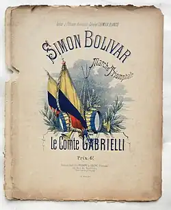 The popularity of the comte Gabrielli, as he was known in the aristocratic and artistic circles du tout Paris, gradually decreased after the fall of Napoleon III and the advent of the Third French Republic. A staunch Bonapartist, he went into semi-secluded retirement in his Paris apartment, but still composed the military march Simon Bolívar (1883), and dedicated it to the President of Venezuela, Antonio Guzmán Blanco. A cantique composed by Nicolò Gabrielli was adopted by the Protestant communities of the French-speaking part of Switzerland as their unofficial hymn, and was later included in the work Chants populaires de Suisse romande pour voix mixtes, published at Geneva in 1887.