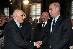 In August 2019, tensions grew within the populist majority, due to Matteo Salvini's motion of no-confidence on Prime Minister Giuseppe Conte.[72] On 20 August, Conte resigned his post to President Mattarella and on the following day, the national direction of the PD officially opened to a cabinet with the Five Star Movement (M5S),[73] based on pro-Europeanism, green economy, sustainable development, fight against economic inequality and a new immigration policy.[74] On 28 August, Zingaretti announced at the Quirinal Palace his favorable position on keeping Giuseppe Conte at the head of the new government,[75] and on same day, Mattarella summoned Conte to the Quirinal Palace for the 29 August to give him the task of forming a new cabinet.[76] The Conte II Cabinet took office on 5 September.[77]