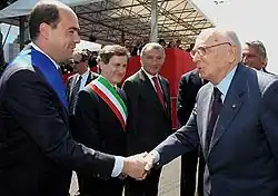 In 2010, Zingaretti refused to run as centre-left candidate in regional election and for this was heavily criticized by some members of his party, like the Mayor of Florence, Matteo Renzi.[26] Few months later during the celebration of the 65th anniversary of the Liberation Day on 25 April 2010, Zingaretti participated together with the new president of Lazio Renata Polverini at an event organized in Rome at Porta San Paolo. However, objects, slogans and insults were thrown toward the stage, contesting Polverini and her political background in the right-wing and Zingaretti was hit in the face by a lemon.[27] After a few minutes, Zingaretti and Polverini were forced to abandon the event.[28]