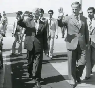 Ceaușescu (left) with Ba'athist dictator Hafez al-Assad (right) during his visit to Syria in 1979. Both of their regimes built neo-Stalinist cults of personality to consolidate power