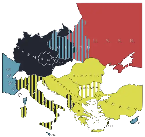 From his posting, Petrescu-Comnen witnessed the revelations of a German–Soviet Pact, which, as he reported to Gafencu, placed Romania in imminent danger.[144] He remained in Rome after the outbreak of World War II a week later. The German invasion of Poland convinced Comnen that there was "no reasoning to be tried with the Germans"—a pessimistic note which contrasted Gafencu's attempts to reach a new understanding with the Axis.[145] According to his own recollections, he was entrusted by Gafencu and Şükrü Saracoğlu with obtaining Italian backing for the Balkan Pact, which was to include a pacified Bulgaria; at the time, Italy was still "non-belligerent".[146] Although Mussolini eventually backed Hitler, Comen still hoped to obtain Italian and papal support for Romania before and during the Second Vienna Award.[147] By April 1940, he was allegedly contacted by Myron Charles Taylor, and through him informed US foreign policy.[148]