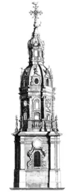 It is not clear why Millich was selected to design the new tower of the St. Paul's Church in Antwerp when he was back in Antwerp around 1680. He designed a Baroque tower top with an octagonal superstructure, which ends with a small lantern turret. The upward lines of this lantern turret consist of herma statues with naked male torsos that look like functional caryatides. The dome of the lantern turret consists mainly of eight volutes that come together at the top. Originally Millich designed four dogs with a torch to sit on top the lantern dome, with another dog running around the globe beneath the cross, functioning thus as an extra wind vane.[7]