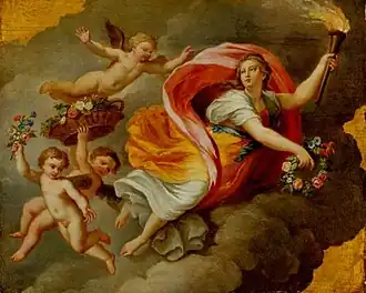 His main works include ceiling paintings for the Solitude Palace and the Hohe Karlsschule (Stuttgart Military Academy) in Germany. With his formal language and allegorical pictorial statements, Guibal's art can be situated in the late Baroque and early Classicism.[2] His work was influenced by that of Anton Raphael Mengs which is evident in his portraits and detail studies. In his designs for large-scale ceiling paintings his French training is reflected.[1]